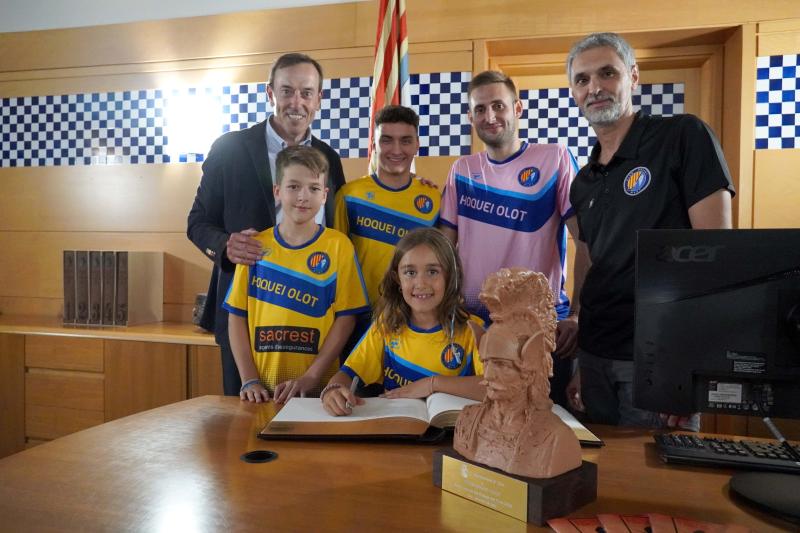Mientras en el balcón del Ayuntamiento continuaban explicando las características de las fiestas y la trayectoria del club; desde la entrada al Consistorio Roger Isern y Anna Prat – que siguen los partidos del Club Hoquei Olot para Ràdio Olot – han apostado por hacer la retransmisión de una jugada que ha tenido lugar delante del Ayuntamiento de Olot con sticks, pelotas y porterías gigantes.