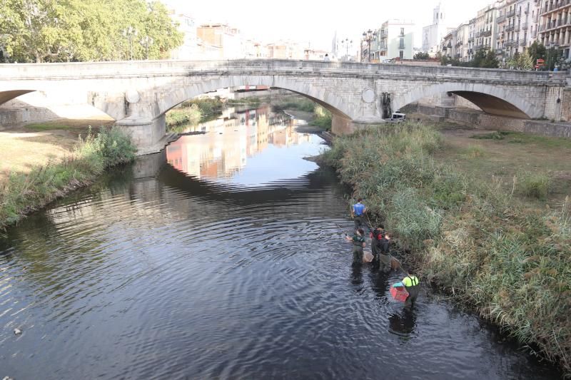 El Ayuntamiento de Girona ha encargado una nueva captura de peces en el tramo urbano del río Onyar por el poco caudal que hay. Este martes a primera hora varios trabajadores se han instalado en la zona de plaza de Catalunya, desde donde han comenzado la captura con pesca eléctrica.