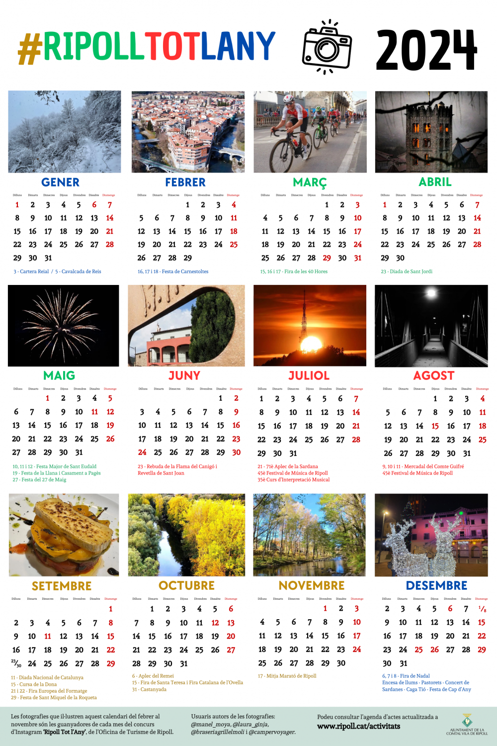 Este 2024, el calendario del Ayuntamiento de Ripoll tiene como protagonistas las fotografías ganadoras de cada mes en el concurso de Instagram ‘Ripoll todo el año’, impulsado por el área de Turismo desde el mes de febrero pasado. Las imágenes que han obtenido más ‘me gusta’ han sido las seleccionadas para ilustrar el calendario.