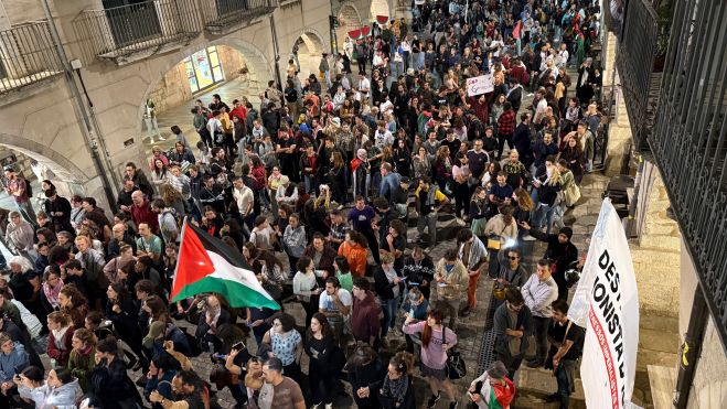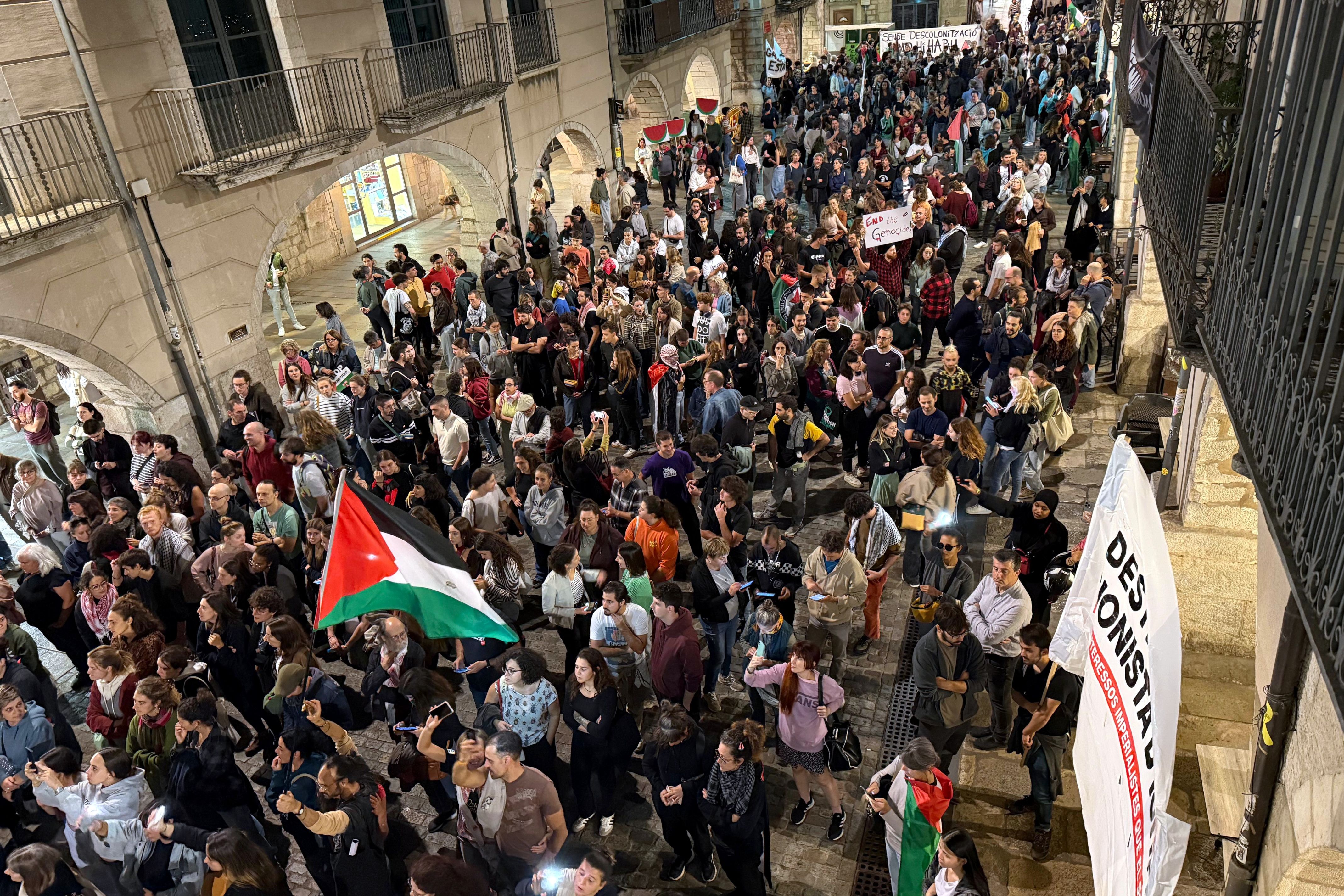 Más de un millar de personas se han manifestado en Girona este miércoles en apoyo a Palestina y para pedir que se rompan las relaciones con Israel. La protesta ha comenzado a las seis y media de la tarde en la plaza Independència con la lectura de un manifiesto que reclamaba el embargo de armas al país judío, que se ponga fin al bloqueo en Gaza y que se sancionen las empresas que sigan comerciando con él. También han mostrado su apoyo a las demandas judiciales presentadas contra el gobierno israelí. La manifestación, convocada por la entidad Girona amb Palestina – BDS y con el apoyo de la mayoría de sindicatos, ha continuado por la avenida Jaume I y ha terminado en la plaza del Vi. Por el camino se han oído proclamas como 'No es una guerra, es un genocidio'.