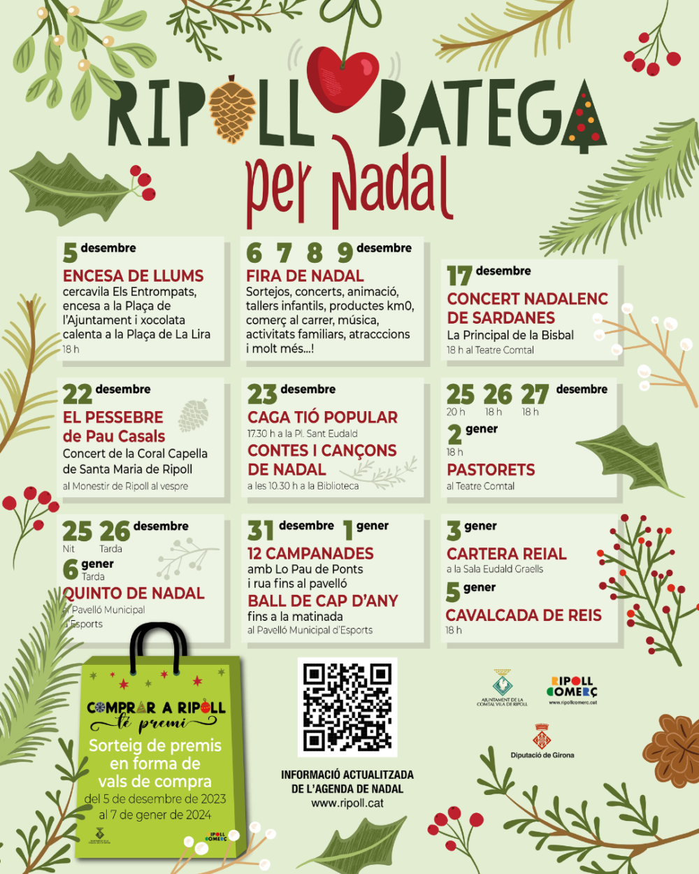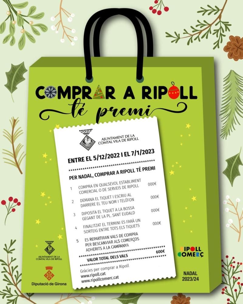 Desde el 5 de diciembre y hasta el 7 de enero, las compras en los establecimientos comerciales o de servicios de Ripoll tienen premio. Cuando se haya comprado, sólo es necesario que se pida el ticket de compra, se escriba el nombre y teléfono detrás y se deposite en la bolsa gigante que está ubicada en la plaza del Ayuntamiento. Finalizado el plazo, se hará un sorteo entre todos los tickets y habrá tres premios, en forma de vales de 300, 200 y 100 euros para canjear en los comercios colaboradores de Ripoll.