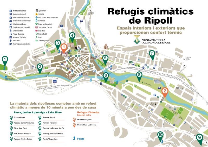 Se adjunta el documento gráfico de los espacios interiores y exteriores que proporcionan confort técnico y el enlace a la web municipal https://ripoll.cat/refugis-climatics-de-ripoll/.