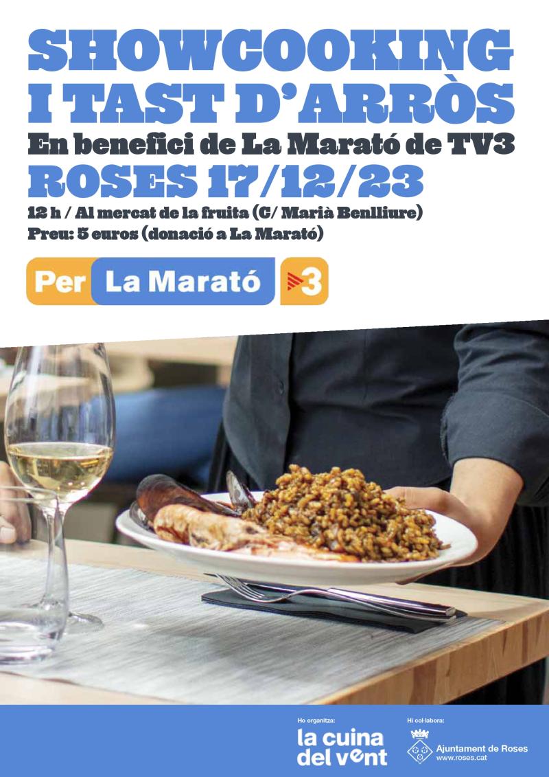 El domingo 17 de diciembre, el colectivo La Cuina del Vent, con la colaboración del Área de Promoción Económica del Ayuntamiento de Roses, organiza un Showcooking con degustación de arroz en beneficio de La Marató de TV3. El acto tendrá lugar a las 12 h en el espacio donde se realiza cada domingo el mercado de fruta y verdura y contará con la participación de los chefs Gregory Abella y Pep Amiel. El ticket de la degustación, con un precio de 5 €, se destinará íntegramente a la Marató de TV3.