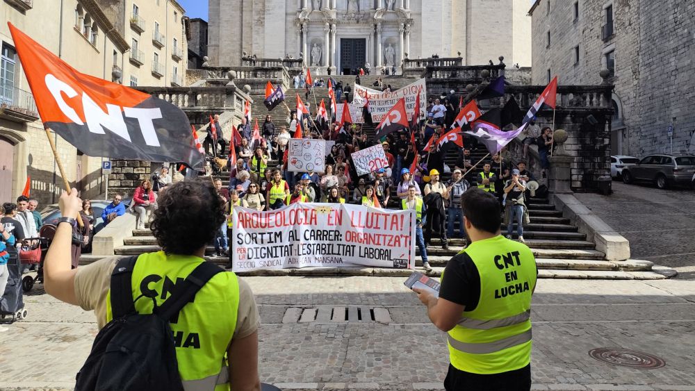 Trabajadores de la empresa de arqueología Aixa–Can Mansana se han manifestado este sábado en Girona en el marco de la huelga indefinida que ya supera los 200 días. La protesta ha recorrido el centro de la ciudad, desde la plaza Independencia hasta la catedral, para visibilizar las reivindicaciones laborales del sector.