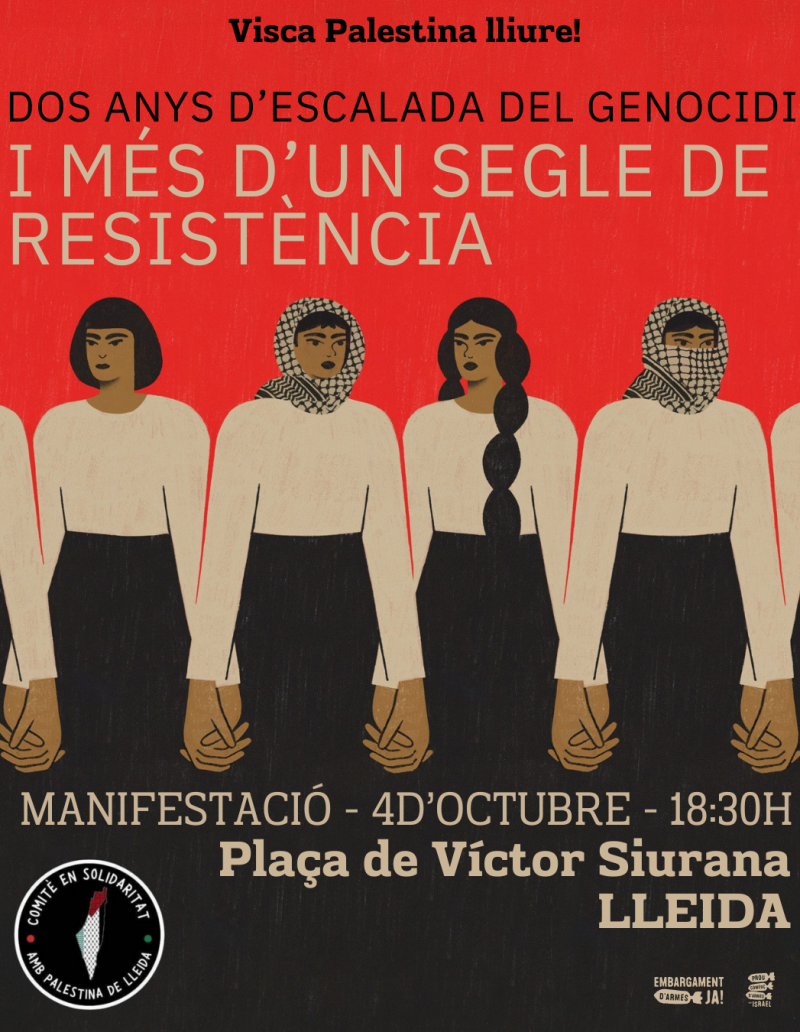 El Comitè en Solidaritat amb Palestina de Lleida ha convocado una manifestació para este sábado, 4 de octubre, a las 18.30 horas en la Plaça Víctor Siurana, en el Rectorado, para denunciar el genocidio en Gaza. En un comunicado, el comitè hace un llamamiento a la ciudadanía "para mostrar nuestro total rechazo a la barbarie sionista ejercida sobre el pueblo palestino, denunciando la complicidad encubierta del Estado español y de las instituciones europeas".