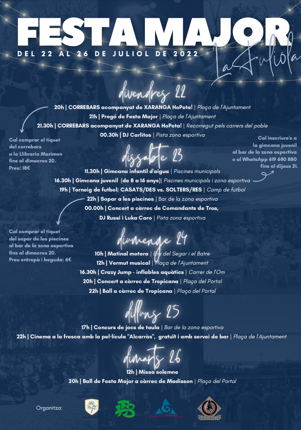 Este año, dentro del marco de la Fiesta Mayor, la Asociación de Jóvenes @lafulibolada ha organizado un correbars el próximo viernes 22 de julio a partir de las 20h, ¡acompañado de la Charanga HoPeta! ????
