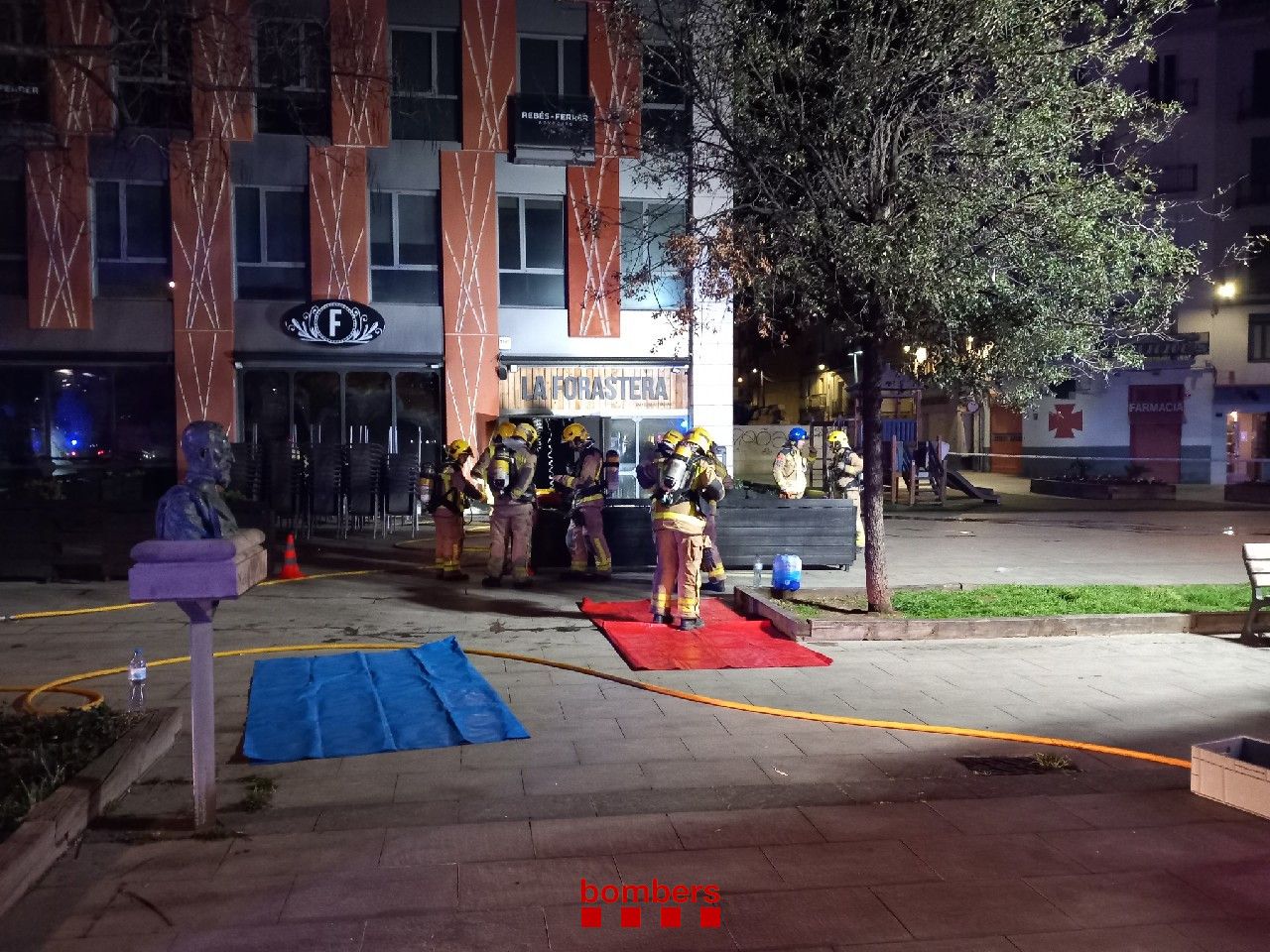 Esta noche, hemos extinguido un incendio en un restaurante de la pl. de Cervantes de Lleida (aviso 02.02h @112). El local, situado en los bajos de un edificio aislado de planta baja más 4 pisos destinados a oficinas, ha quedado totalmente quemado. No ha habido heridos.