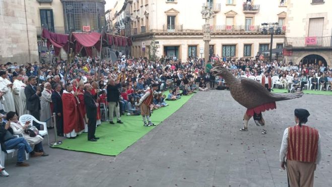 El amplio abanico de cultura popular se convierte, un año más, en uno de los protagonistas indiscutibles de la Fiesta Mayor de Tàrrega. Hoy viernes, jornada en que la capital de l'Urgell ha honrado las Santas Espinas, se ha celebrado la Eixida, encuentro que aglutina los bailes tradicionales de la ciudad. Después de dos años de pandemia, el acto se ha recuperado en su formato habitual en la plaza Mayor, escenario donde se ha congregado un numeroso público. La exhibición ha sido encabezada por el Águila, elemento solemne del bestiario, y la danza de la Eixida, que por primera vez ha abierto la alcaldesa Alba Pijuan Vallverdú y el actual consistorio.