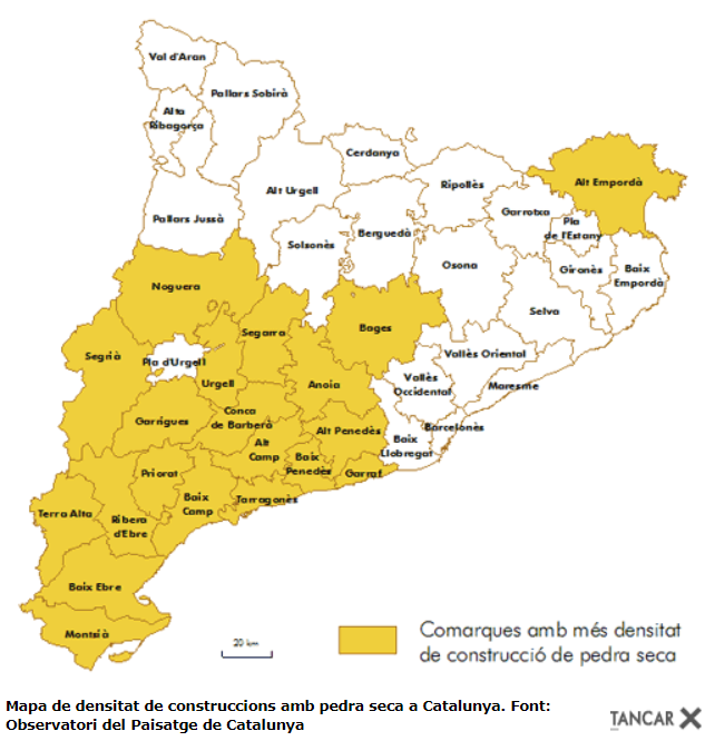 Las construcciones de piedra seca tienen un gran valor histórico y son un auténtico referente identitario en muchos territorios donde predominan. Las comarcas de la llanura de Lleida, como el Segrià, el Urgell, las Garrigues o la Segarra, conforman uno de los territorios con más densidad de construcciones de este tipo de toda Cataluña. En este sentido, han configurado a lo largo de los siglos unos paisajes agrícolas y ganaderos de gran valor dominados sobre todo por el olivo, la viña, el almendro y los cereales, plenamente adaptados a los suelos y al clima.
