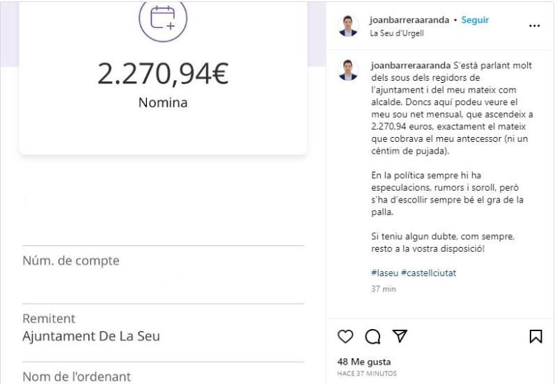 En su publicación ha explicado que recibe cada mes la misma cantidad que recibía su antecesor, Francesc Vilaplana.