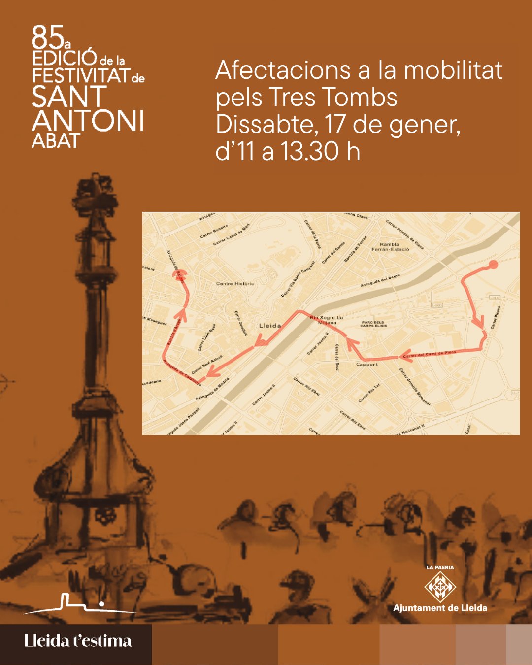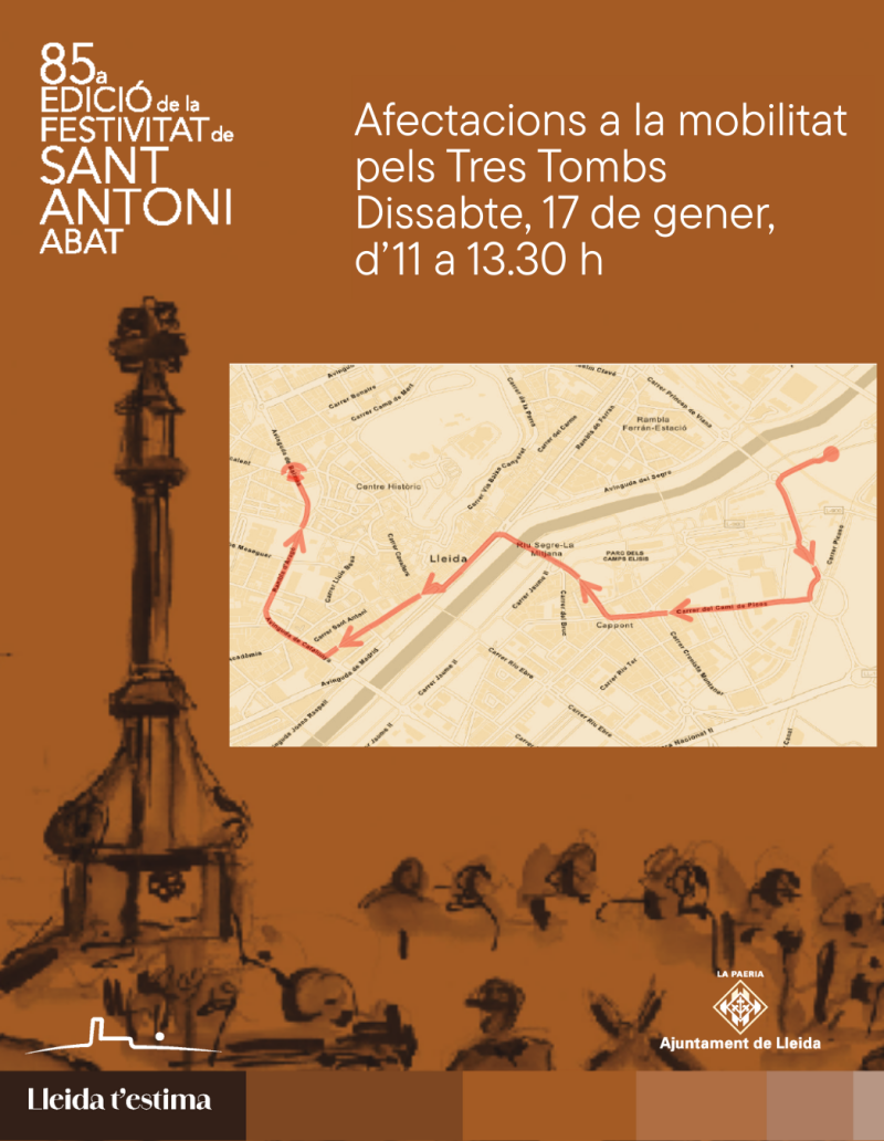 Lleida celebrará este sábado, 17 de enero, el tradicional desfile de los Tres Tombs de Sant Antoni Abat, que este año presenta un cambio en el recorrido habitual. El desfile se iniciará a las 11.15 horas desde el recinto de las Firetes, situado en el camino de Granyana, y está previsto que finalice aproximadamente a las 13.30 horas en la Creu dels Tres Tombs