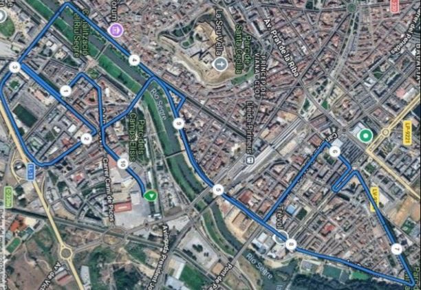- Campos Elíseos “Pabellón Ferial 3” – avenida Alicante – avenida Valencia – calle Río Ebro – avenida Doctora Castells – avenida Garrigues – avenida Barcelona – avenida Estudio General – Puente Universidad – plaza de España – avenida Madrid – avenida Blondel – avenida Francesc Macià – Rambla Ferran – calle Riquer – avenida Segre – avenida Tortosa – calle Barón de Maials – calle Condes de Urgell – calle Corregidor Escofet – calle Xavier Puig i Andreu – avenida Pearson – avenida Tortosa – avenida Segre – Puente Viejo – avenida Garrigues – avenida Alicante – Campos Elíseos “Pabellón Ferial 3”.