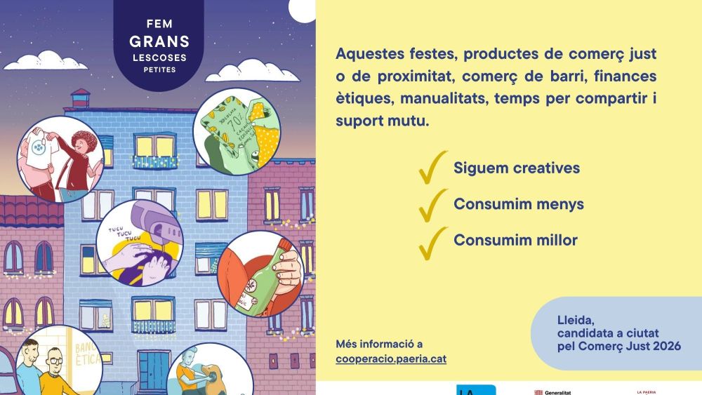 La Regidoria de Cooperació, como miembro de la Xarxa de Municipis pel Comerç Just, difunde este mes de diciembre la campaña “Fem grans les coses petites”, una iniciativa destinada a promover un consumo responsable y transformador. La campaña, liderada por LaCoordi, Comercio Justo y Finanzas Éticas, ofrece a la ciudadanía alternativas de consumo con el objetivo de transformar el entorno económico y social y avanzar hacia un mundo más justo y sostenible. Entre los recursos disponibles se incluyen una página web, cómics y una exposición itinerante.