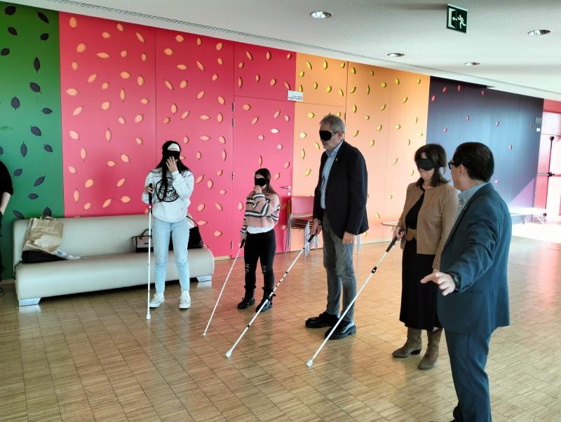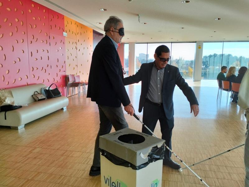 En la segunda actividad, los participantes se han puesto en la piel de una persona con discapacidad visual, organizada por el consejero territorial de la ONCE en Lleida, Antonio Romero, tapados con un antifaz y ayudados con un bastón blanco para invidentes, y que han tenido que ir superando obstáculos.