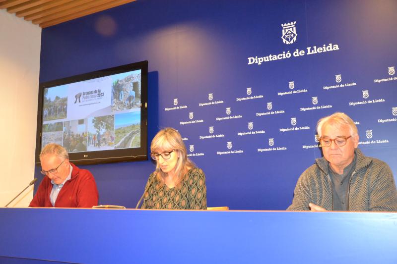 La vicepresidenta de la Diputación, Sandra Castro; el alcalde de Torrebesses y miembro de la Asociación de Micropueblos de Cataluña, Mario Urrea, y también miembro de Micropueblos, Jordi Tarragó, han participado este martes en la rueda de prensa de presentación de la 4a Semana de la Piedra Seca, que se celebrará en Torrebesses, pero también por diversos lugares de Cataluña, la Comunidad Valenciana y Andorra, entre los días 24 de noviembre y 3 de diciembre.