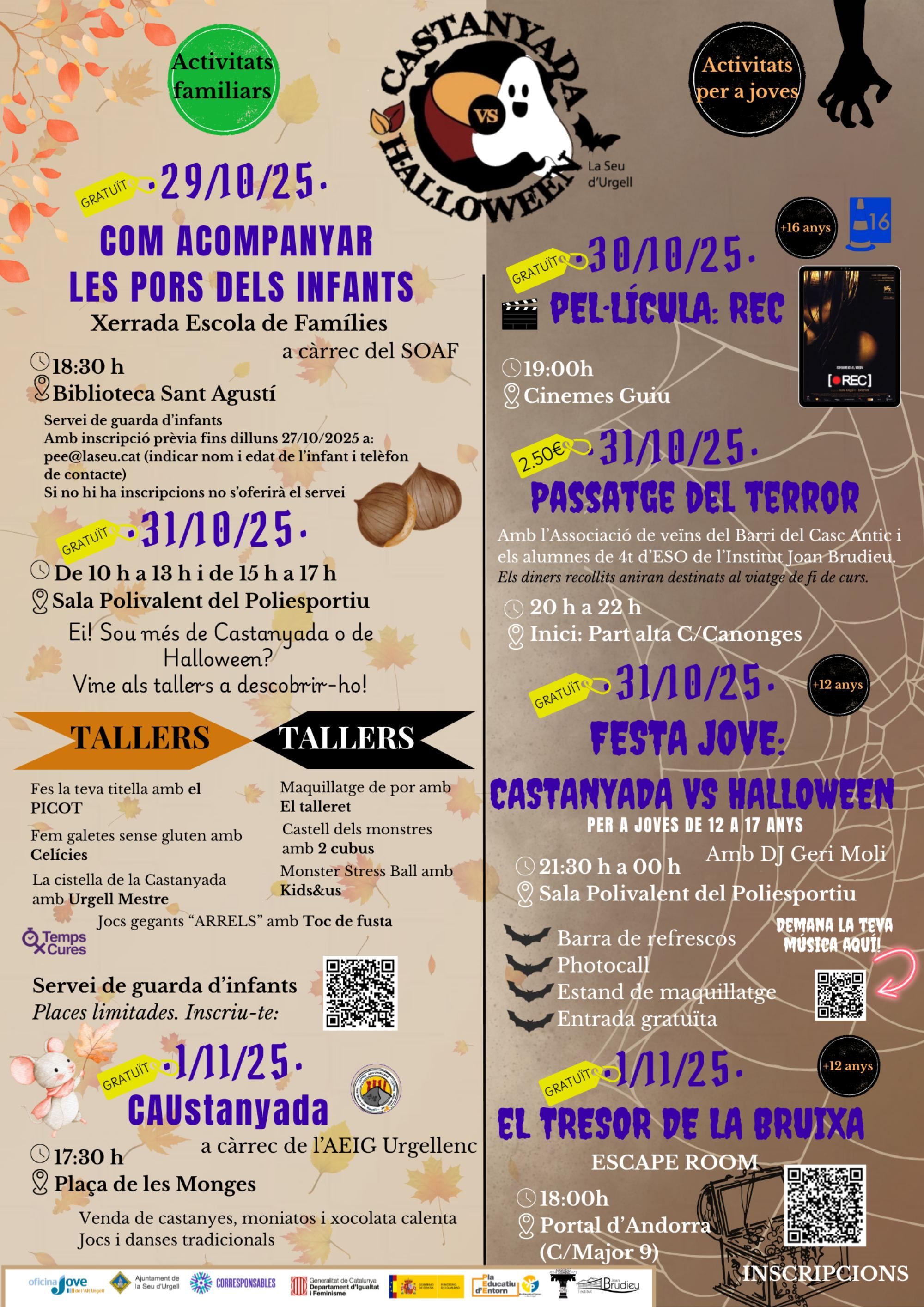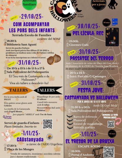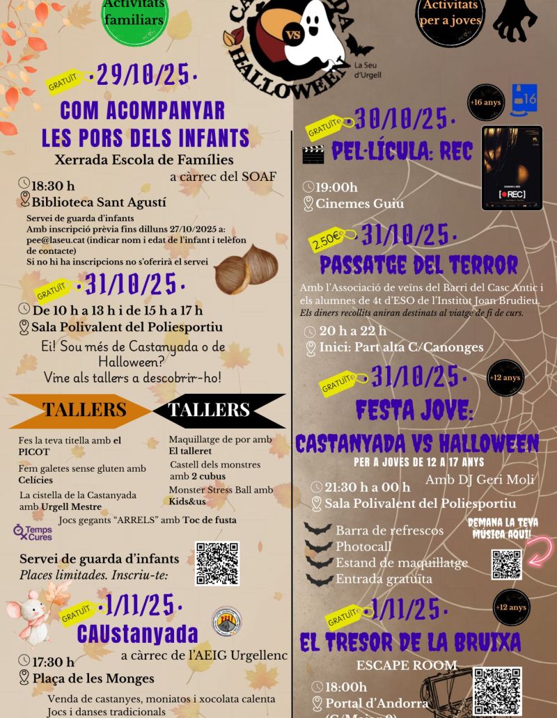 El Área de Infancia y Juventud, y el Área de Educación, a través del Plan Educativo de Entorno, del Ayuntamiento de la Seu d'Urgell, han organizado el programa de ocio y educativo ‘Castañada vs. Halloween’ con más de media docena de propuestas que se dirigen tanto al público familiar como al público juvenil, que tendrán lugar del 29 de octubre al 1 de noviembre.