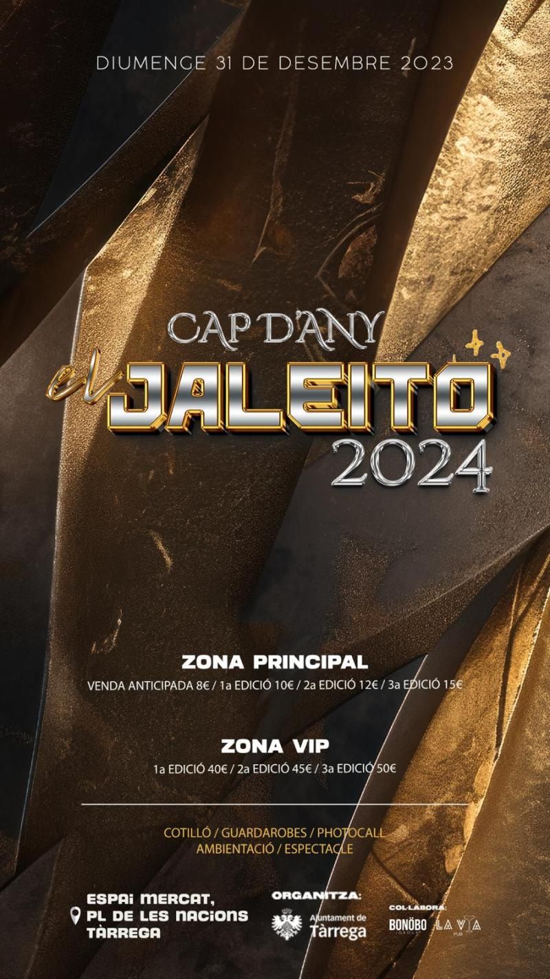 El Ayuntamiento de Tàrrega volverá a organizar la fiesta de Fin de Año en la ciudad el próximo 31 de diciembre. La cita comenzará a la 1 de la madrugada, cuando se abrirán las puertas del Espai MerCAT para despedir el 2023 y dar la bienvenida al nuevo año con la música propuesta bajo la marca 'El Jaleito 2024'.