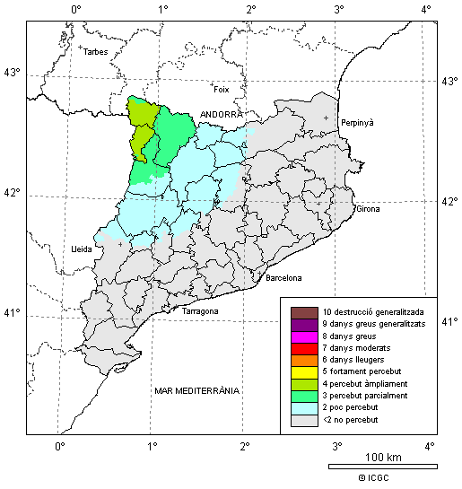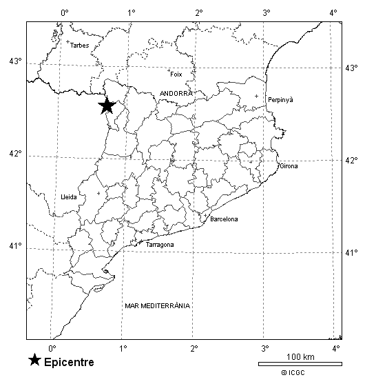El Instituto Cartográfico y Geológico de Cataluña (ICGC) ha recibido información del seísmo sobre las ocho menos cuarto de la noche y la localización provisional de el epicentro lo ha situado en la demarcación aragonesa, al límite con la Franja de Ponent.