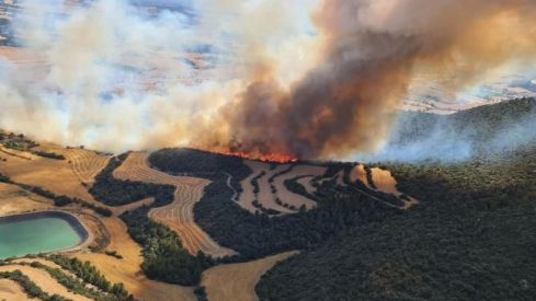 El fuego que quema en Artesa de Segre desde las cinco de la tarde de este miércoles continúa activo y ha afectado hasta ahora 75 hectáreas, mitad agrícolas mitad forestales, según los cálculos actualizados de los Agentes Rurales. Los Bomberos, que han aumentado las dotaciones para atacar las llamas hasta las 34 terrestres y las 12 aéreas, han explicado que el fuego ha cogido rápidamente fuerza y se ha propagado en dirección norte hacia el núcleo de la Força.