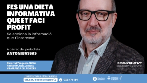 El periodista Antoni Bassas será el protagonista de la próxima sesión del programa Desenvolupa’t, impulsado por el Servicio de Promoción Económica del Ayuntamiento de Vilafranca del Penedès. La cita será el martes 27 de enero, con la conferencia Haz una dieta informativa que te aproveche, una propuesta que quiere ayudar a poner orden en el consumo de información en un contexto marcado por la inmediatez y la saturación de contenidos.