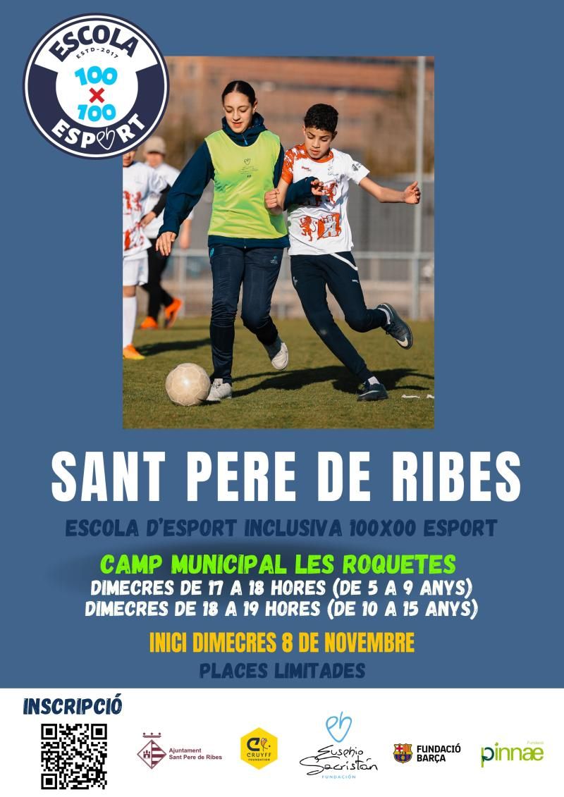 La Fundación Eusebio Sacristán ha puesto en marcha en el municipio, con la colaboración del Ayuntamiento de Sant Pere de Ribes, la Escuela Inclusiva 100 x 100 Deporte, después de la prueba piloto de este proyecto que realizó el pasado mes de mayo en la pista Cruyff Court de les Roquetes, con la colaboración de la Fundación Barça, la Cruyff Foundation y el consistorio. Las actividades, que ya se han iniciado, se realizan cada miércoles en el campo de fútbol municipal de les Roquetes.