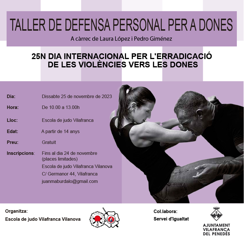 El mismo sábado 25 de noviembre, de 10 a 13h, habrá un curso de defensa personal para mujeres en la Escuela de Judo Vilafranca, en la c/ Germanor, 44. Es una actividad gratuita y dirigida a mujeres mayores de 14 años. Las inscripciones se pueden hacer hasta el viernes día 24 y las plazas son limitadas. Se deben hacer por correo electrónico a juanmaburdalo@gmail.com. El curso está organizado por la Escuela de Judo Vilafranca Vilanova con la colaboración del Servicio de Igualdad del Ayuntamiento de Vilafranca.