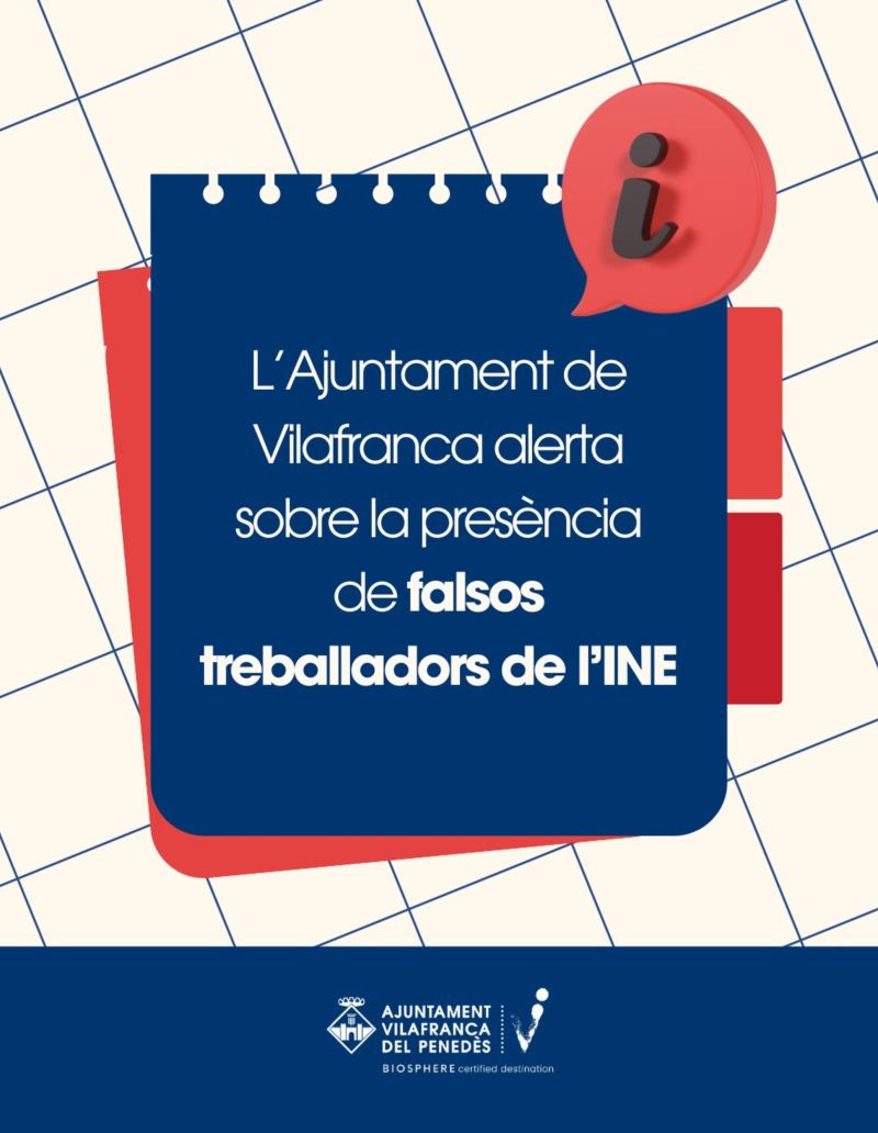 El Ayuntamiento de Vilafranca del Penedès ha emitido un aviso urgente para alertar a la ciudadanía sobre la aparición de falsos trabajadores del Instituto Nacional de Estadística (INE) que se están presentando en domicilios particulares de la villa. Según la información facilitada por el Ayuntamiento, estas personas se hacen pasar por miembros del INE y piden datos personales de los residentes. Los supuestos trabajadores del censo, que llevan un portátil y una cámara para hacer fotografías de los habitantes de las casas, han generado inquietud y preocupación entre la población.