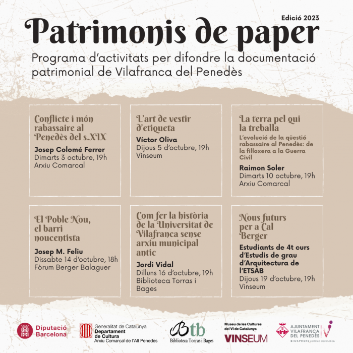 El 5 de octubre se inicia el ciclo Patrimonios de papel, que quiere difundir la documentación patrimonial de Vilafranca del Penedès a través de un programa de seis conferencias de expertos locales y externos. El ciclo está organizado conjuntamente por la Biblioteca Torras i Bages, Vinseum y el Archivo Histórico Comarcal, tres instituciones ubicadas en Vilafranca que trabajan con documentación de interés local y comarcal.