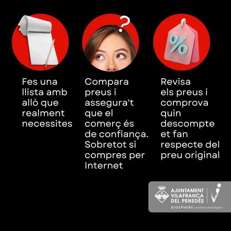 Este viernes 24 de noviembre es el Black Friday, una fecha en la que muchas personas aprovechan para adelantar las compras navideñas. Y el lunes 27 de noviembre, tiene lugar el llamado Cyber Monday. Por ello, tiendas físicas y las que venden por Internet ya han comenzado a anunciar descuentos y ofertas. Con este motivo, la Oficina Municipal de Información al Consumidor (OMIC) de Vilafranca del Penedès divulga unos consejos para un consumo responsable en estas fechas. El consejo principal es consumir lo justo y necesario y, si se tiene que comprar durante estos días, hay que aplicar un sentido crítico hacia la publicidad, comprar con criterio y reflexionar antes sobre la necesidad, para evitar compras impulsivas y poco satisfactorias.