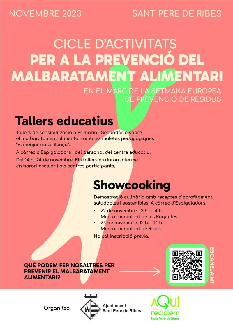 También se realizarán dos showcooking, a cargo de Espigoladors, en los mercados ambulantes del municipio, donde se hará una demostración culinaria con recetas de aprovechamiento, saludables y sostenibles. Tendrán lugar el 22 de noviembre, de 12 h a 14 h, en el mercado ambulante de las Roquetes, y el 24 de noviembre, también de 12 h a 14 h, en el mercado ambulante de Ribes. No es necesaria inscripción previa.