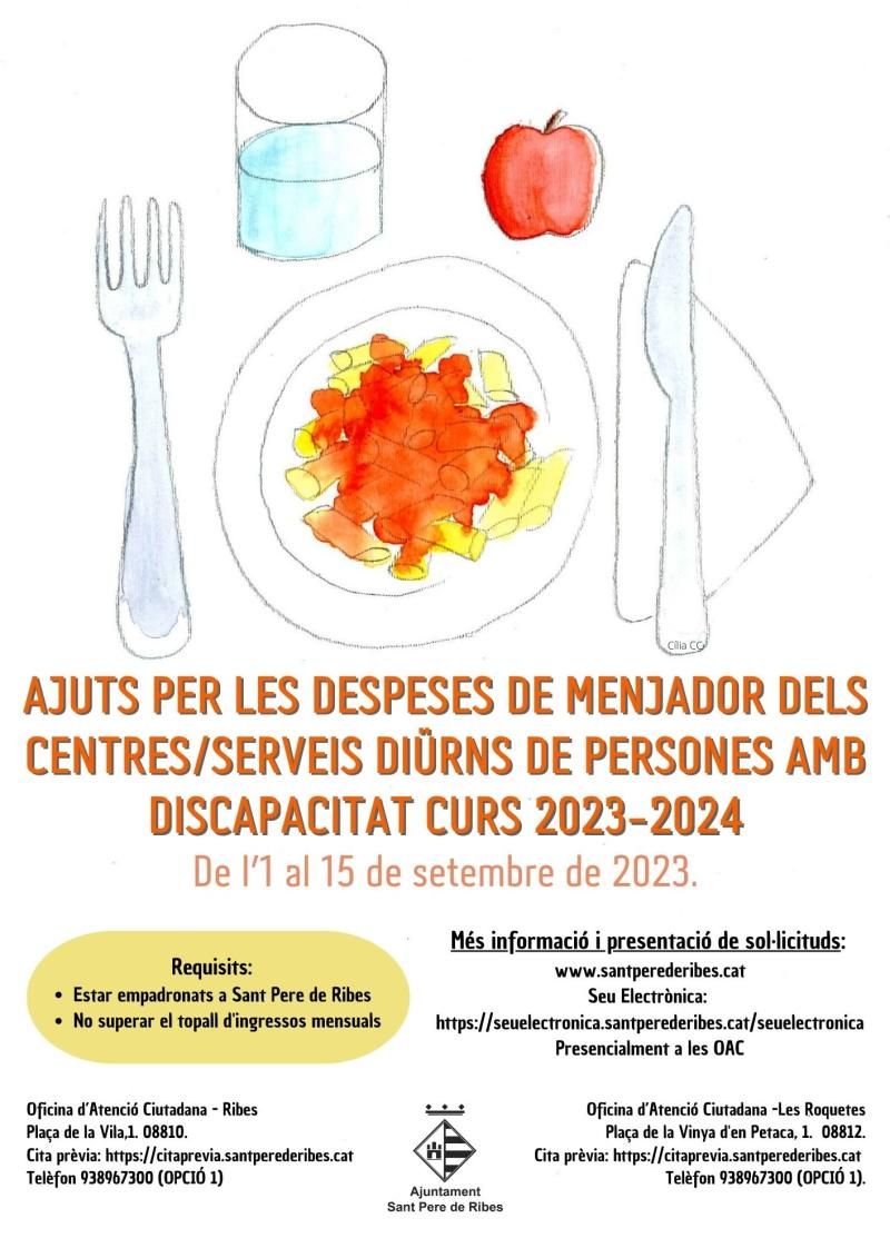 El Departamento de Servicios Sociales del Ayuntamiento de Sant Pere de Ribes abre convocatoria de ayudas económicas municipales dirigida a personas del municipio con alguna discapacidad, que puedan encontrarse en situación económica y social precaria, para poder cubrir los gastos de comedor de los centros/servicios diurnos. El período para solicitar las ayudas será desde el viernes 1 de septiembre hasta el 15 de septiembre.