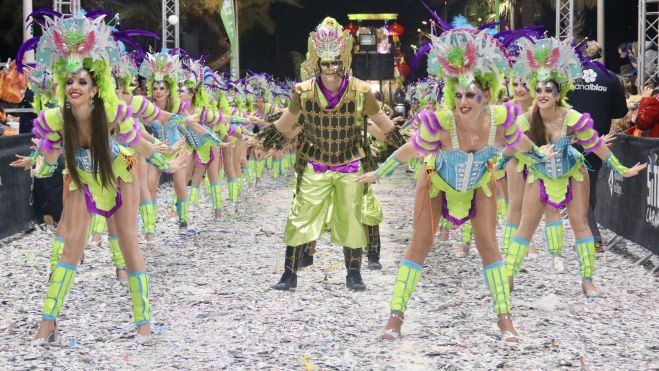 El desfile del Exterminio ha vuelto a convertir el paseo en un escaparate de lentejuelas, coreografías y kilos de confeti. Las plumas, la pintura corporal y la poca ropa —a pesar del frío de febrero— han sido, un año más, el sello más reconocible del Carnaval sitgetano. La banda sonora también ha tenido su protagonismo, con grandes clásicos de la fiesta y guiños a la actualidad musical.
