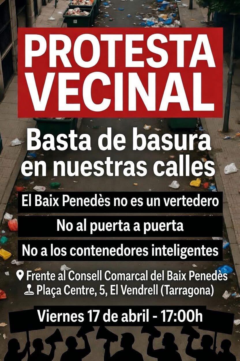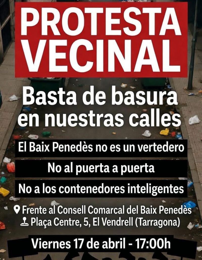 Los cambios, sin embargo, no han sido bien recibidos por parte de la ciudadanía y se espera que esta tarde haya una manifestación en contra de las modificaciones en el sistema de recogida de residuos. En un cartel sin logos de partidos, se ha convocado a los vendrellenses a concentrarse frente a la sede del Consell Comarcal a las 17.00 horas bajo el lema "Basta de basuras en nuestras calles". Aunque no hay ninguna formación política que la reivindique como propia, fuentes del Ajuntament del Vendrell confirman que tienen constancia de la implicación de VOX detrás de esta movilización. De hecho, se trata del único partido con representación en el consistorio que ha hecho un llamamiento en redes a participar, impulsando y fomentando la protesta vecinal. La formación de ultraderecha cuenta con dos concejales en la capital del Baix Penedès y en las últimas elecciones municipales fue la tercera fuerza con el 9,71% de los votos.