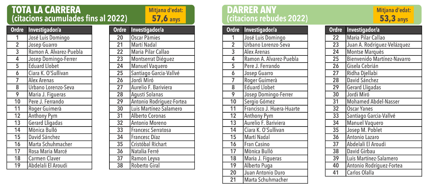 En cuanto a la edad del personal investigador, se observa una pequeña desviación entre las dos listas. Mientras que la media de edad de los investigadores de la URV más influyentes el último año se sitúa en 53,3 años, esta se eleva hasta los 57,6 años en los investigadores más influyentes cuando se tiene en cuenta toda su carrera.