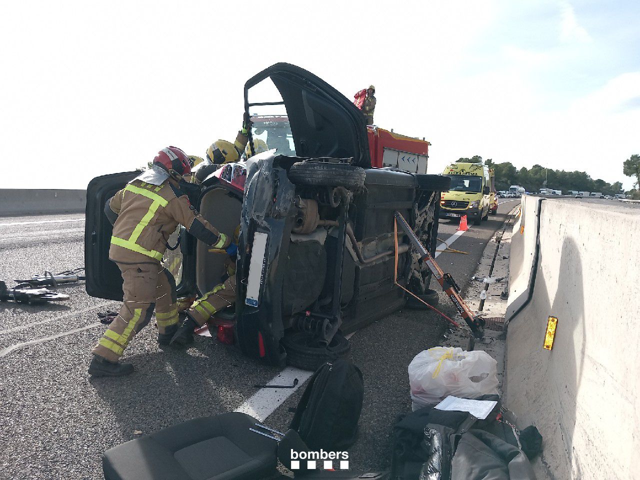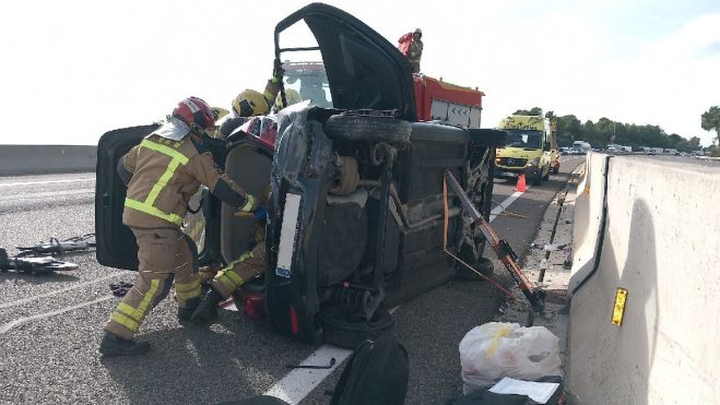 Los Bomberos de la Generalitat han intervenido este mediodía en un accidente de tráfico en la AP-7, a la altura de Tarragona, en el que un vehículo ha chocado contra la mediana y ha volcado, dejando dos personas atrapadas en el interior. El aviso se ha recibido a las 12.51 horas a través del 112.