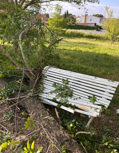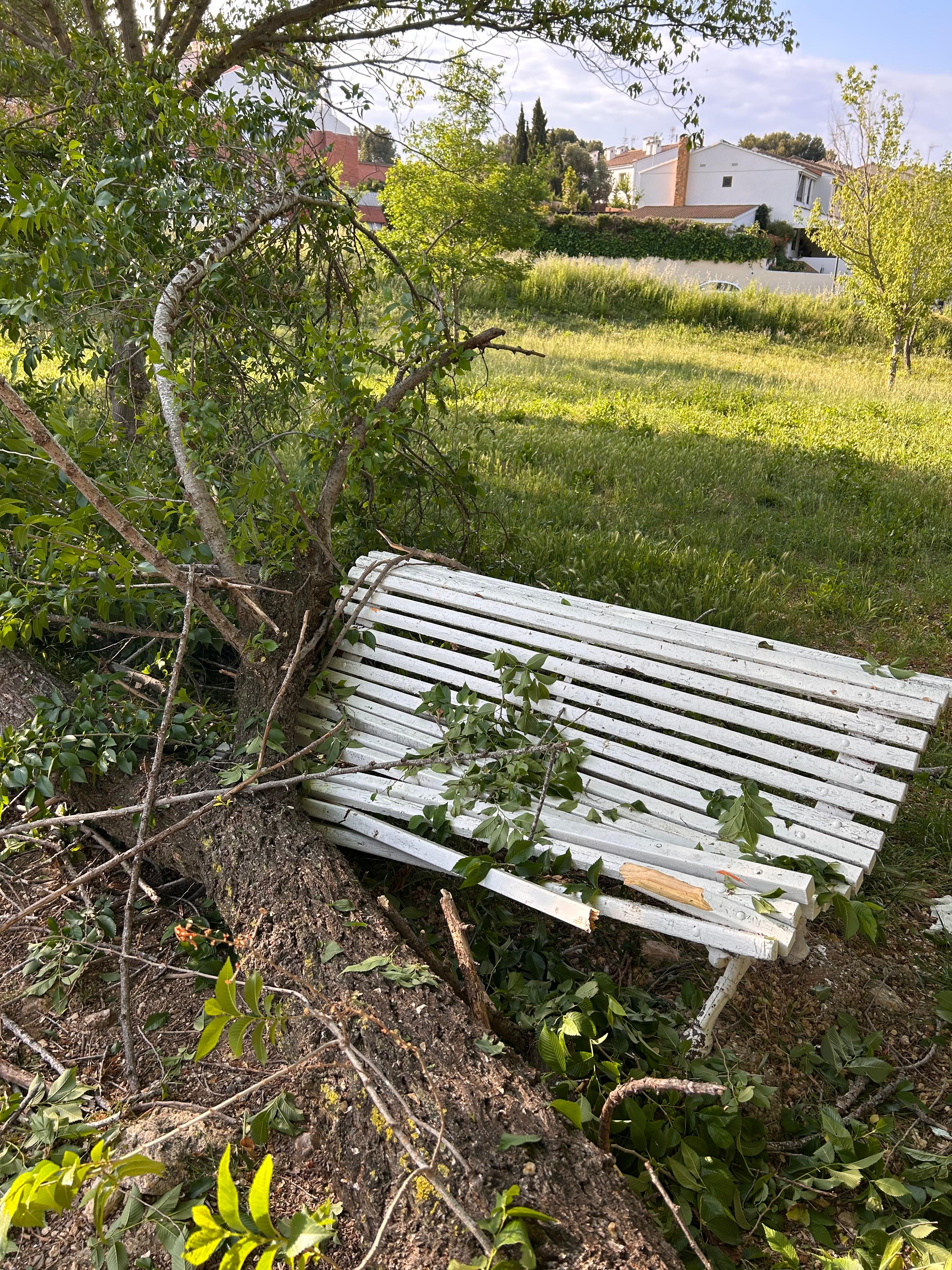 La fuerza de la caída ha sido tal que la rama ha destrozado completamente el banco, rompiendo su estructura de madera.