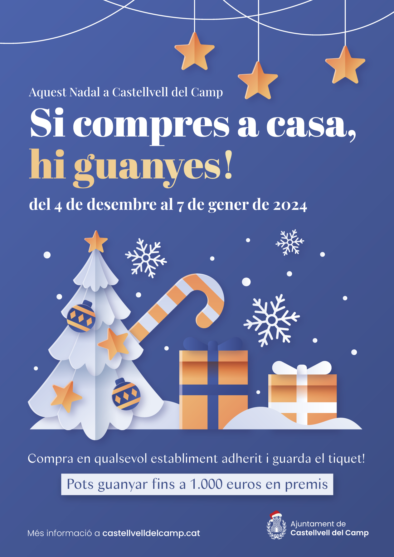 Este lunes arranca la cuarta edición de la campaña de Navidad “Si compras en casa, ganas”, promovida por el Ayuntamiento de Castellvell del Camp, que durará desde el 4 de diciembre de 2023 hasta el 8 de enero de 2024. Este año participarán 14 tiendas, comercios y bares-restaurantes, que ofrecerán a sus clientes un ticket por cada 5 euros de compras. Estos tickets (números) participarán en un sorteo de siete premios por un valor total de 1.000 euros: un premio de 300 euros, un premio de 200 euros y cinco premios de 100 euros, los ganadores de los cuales podrán canjear en compras en los establecimientos del municipio adheridos a la campaña.
