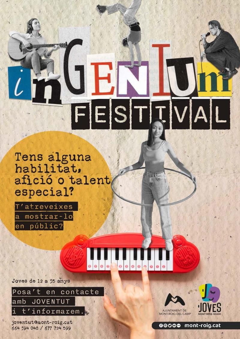 El Departamento de Juventud del Ayuntamiento de Mont-roig del Camp pone en marcha el festival INGENIUM, una propuesta para que los jóvenes puedan mostrar sus habilidades, aficiones o talento en público. Este evento tendrá lugar el jueves día 28 de septiembre a partir de las 9 de la noche como parte de las celebraciones de las Fiestas de San Miguel.