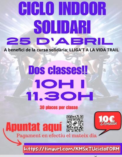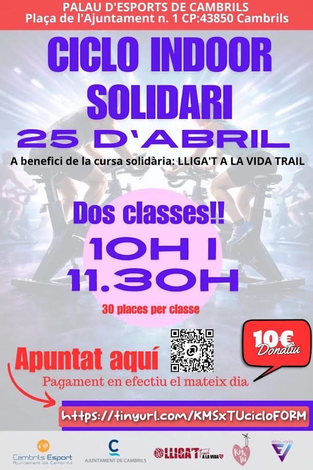 El Palacio Municipal de Deportes de Cambrils acogerá una jornada solidaria de ciclo indoor el sábado 25 de abril. KMxTU ha organizado dos sesiones dirigidas, a las 10 h y a las 11.30 h, con una capacidad de 30 plazas por clase.