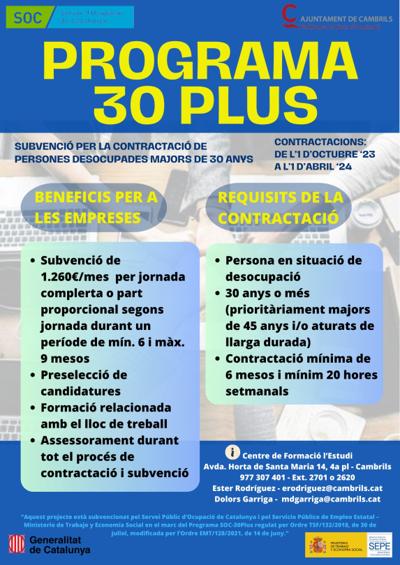 El Departamento de Educación y Empleo del Ayuntamiento de Cambrils ha finalizado con éxito el programa de inserción laboral SOC-30 PLUS 2022 y ya ha abierto una nueva convocatoria de este proyecto que se basa en las necesidades reales de las empresas del territorio y prioriza los colectivos con más dificultades para encontrar trabajo.