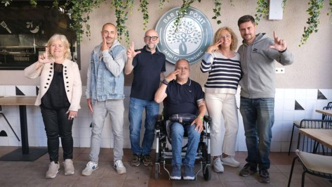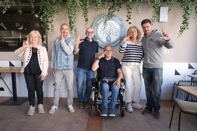 La concejala de Fiestas,Teresa Recasens; el ideólogo de la Fiesta Remember y copropietario de la mítica discoteca,Ángel Pérez; el presidente de la asociación Els Molla'ls, Fran Rodríguez; los representantes de Swim for ELA, Siscu Morell y Joana Bono, y el responsable de Cambrils por los Valientes, Sito Cano, han escenificado hoy la entrega del donativo solidario con una rueda de prensa en el bar El Pósito.