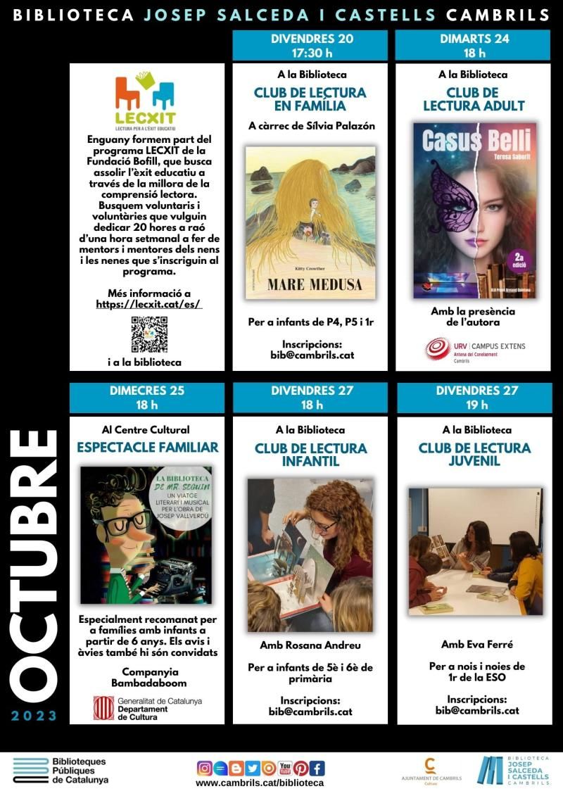 Por otra parte, durante el mes de octubre se reanudarán los encuentros de todos los clubes de lectura. El Club de Lectura en familia, para niños y niñas de I4, I% y 1º, tiene una cita el 20 de octubre para comentar el libro “Mare Medusa” de Kitty Crowther. El Club de Lectura Adulto, que ya se puso en marcha en septiembre, disfrutará de una sesión especial abierta con la escritora Teresa Saborit, dentro de la programación del Campus Extens de la URV. Finalmente, el 27 de octubre iniciarán el curso los clubes de lectura infantil y juvenil.