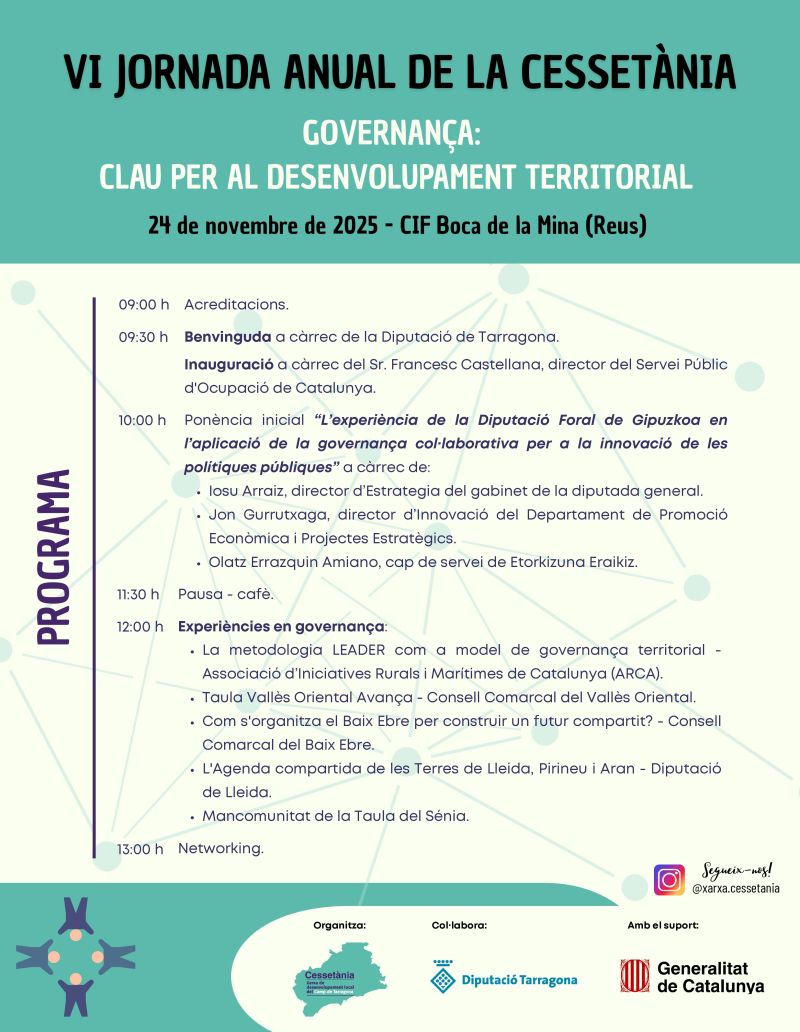 La Cessetània, la red de desarrollo económico local del Camp de Tarragona, celebrará su jornada anual el lunes 24 de noviembre, a partir de las 9 de la mañana, en Reus, en el Centre de Formació Boca de la Mina de la Diputación de Tarragona. La asistencia es abierta, pero es necesaria inscripción, por cuestiones de aforo, en el siguiente enlace: https://forms.gle/1v6jd6JCKBU7kqpF9.