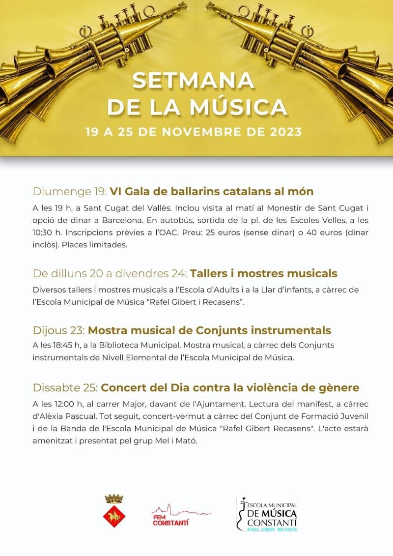 Del 19 al 25 de noviembre tendrá lugar una nueva edición de la Semana de la Música en Constantí, con toda una serie de propuestas musicales organizadas por el Ayuntamiento con la colaboración de la Escuela Municipal de Música “Rafel Gibert Recasens”.