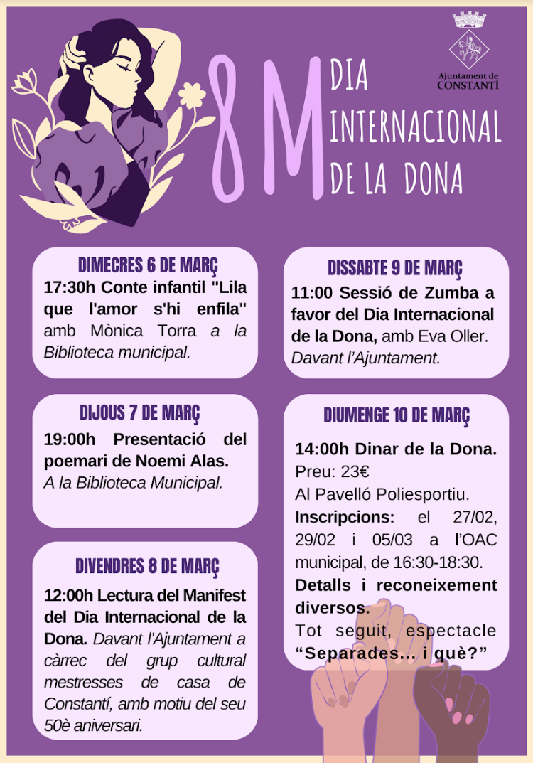 Coincidiendo con la celebración del Día Internacional de la Mujer, el 8M, el Ayuntamiento de Constantí ha programado durante la semana próxima diversas actividades dirigidas principalmente al colectivo de mujeres del municipio, con el objetivo de reivindicar un año más la igualdad de derechos entre los hombres y las mujeres.El acto central tendrá lugar el mismo día 8 de marzo, a las 12 del mediodía, con la lectura del manifiesto ante el Ayuntamiento a cargo del Grupo Cultural Amas de Casa, con motivo de la celebración de su 50 aniversario.