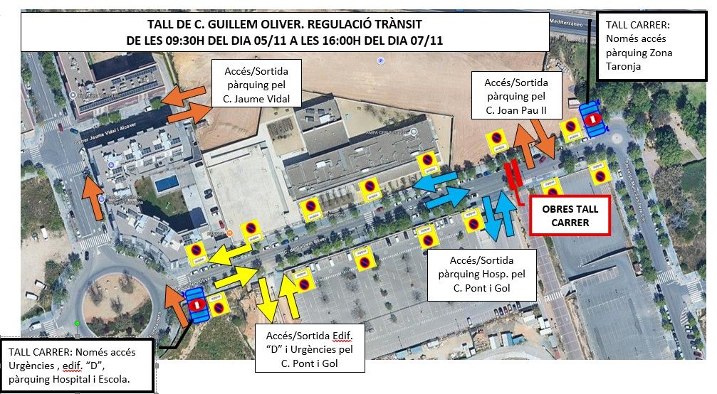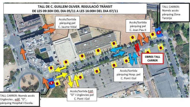 Unas obras de la empresa Endesa en la calle Guillem Oliver cortarán esta vía durante un par de días. Está previsto que el 5 de noviembre, a las nueve y media, se restrinja la circulación de vehículos hasta las 16 h del día 7. La intervención se basa en la ejecución de una zanja entre el acceso al parking del Hospital y el acceso al parking disuasorio de zona naranja.
