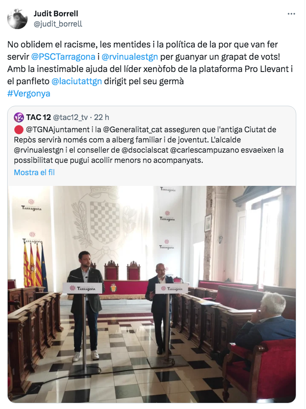 El alcalde de Tarragona, Rubén Viñuales, y el consejero de Derechos Sociales, Carles Campuzano, cerraron ayer definitivamente el debate sobre el futuro de la Ciutat Residencial. Lo hacían con el compromiso de modificar el Plan Especial de la Ciutat de Repòs i de Vacances y excluir así el posible uso del equipamiento como centro de menores. De esta manera, se garantiza que el albergue sea "para familias y jóvenes" y se disipan las dudas que un buen número de vecinos tuvieron. La noticia, en lugar de verse como un avance, se utilizó por parte de la mayoría de los consejeros de ERC para atacar al PSC y a los vecinos de Llevant, que ya habían acusado de "racistas" durante las consultas sobre el albergue. Además, la ex jefa de gabinete de Ricomà, Judit Borrell, también aprovechó la ocasión para lanzar graves acusaciones contra este medio.
