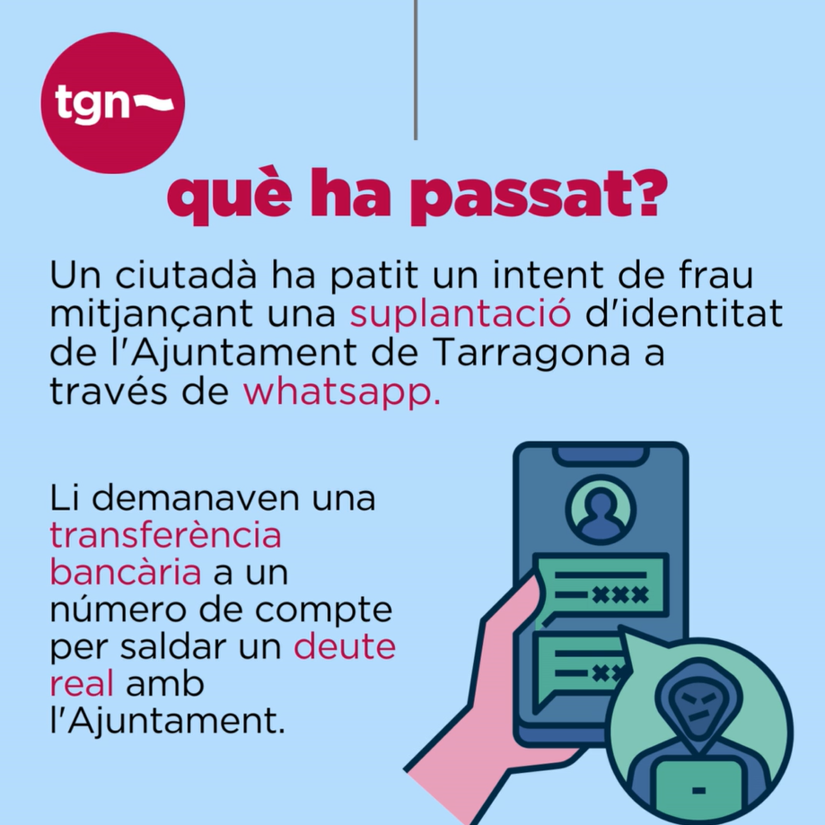 Se da la circunstancia de que un ciudadano sufrió recientemente un intento de fraude mediante una suplantación de identidad del Ayuntamiento de Tarragona a través de whatsapp. Le pedían una transferencia bancaria a un número de cuenta para saldar una deuda real con el Ayuntamiento.