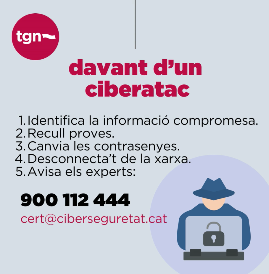 - Avisar a los expertos de la Agencia de Ciberseguridad de Cataluña: 900 112 444 | cert@ciberseguretat.cat