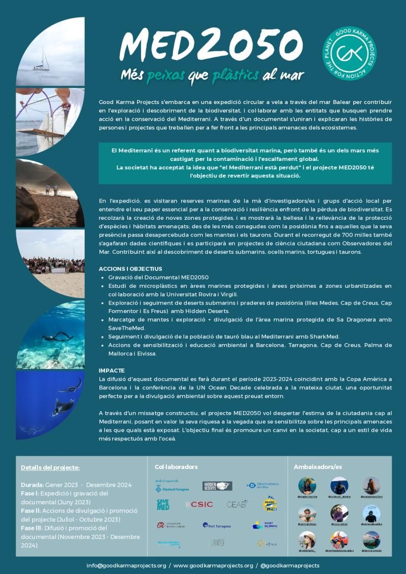 MED 2050 es un proyecto de la ONG local Good Karma Projects que cuenta con el apoyo de la Diputación de Tarragona y del Puerto de Tarragona, también de las empresas Oh!tels y Becharter y de la Fundación Wearewater.
